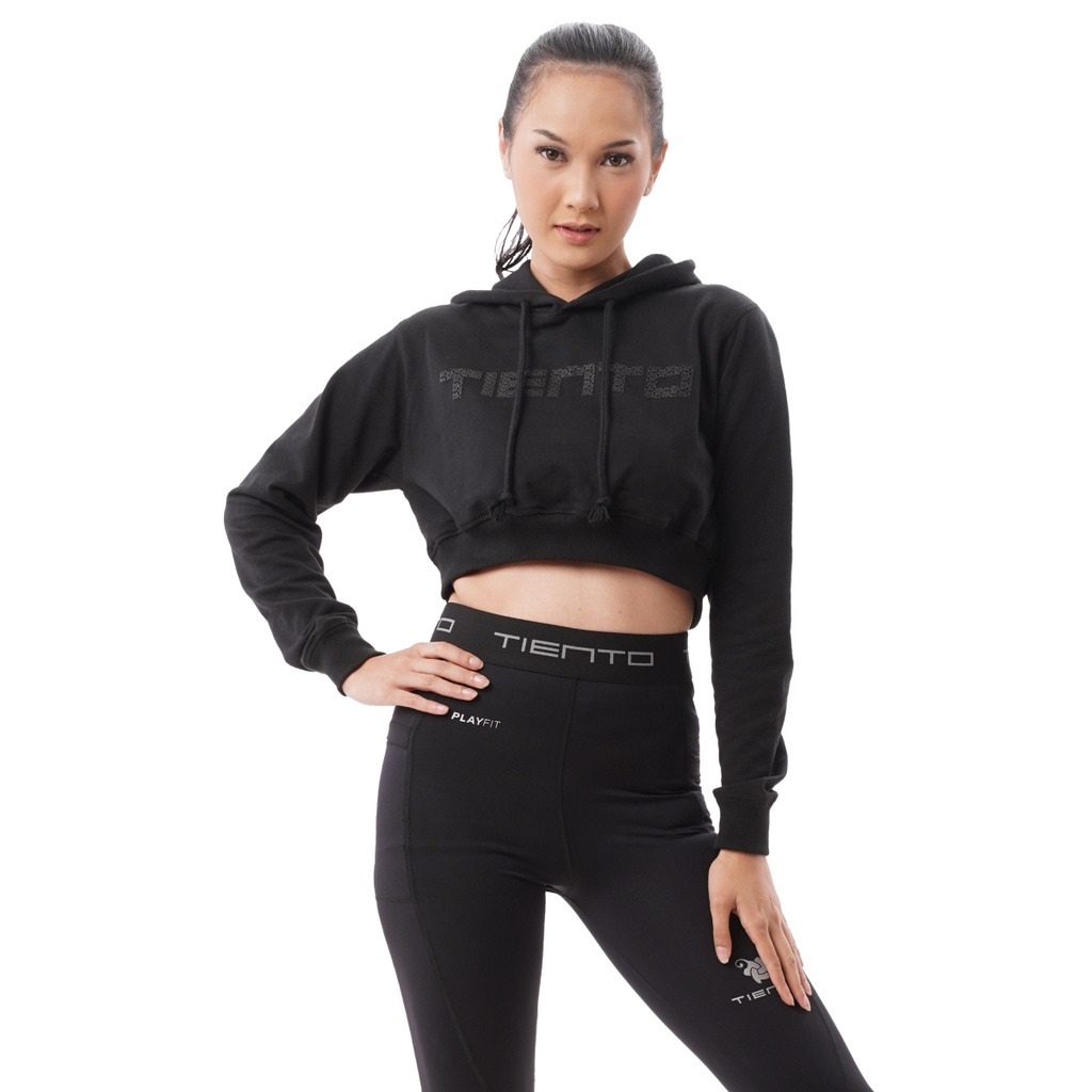 Jual Tiento Women Crop Top Hoodie Sport Black Sweater Olahraga Wanita Baby Terry Hitam Shopee Indonesia